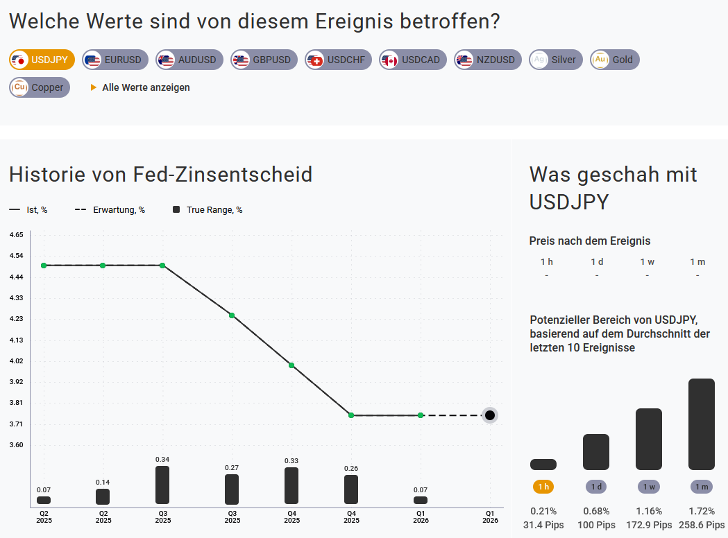 Sollte die Notenbank signalisieren, dass Zinssenkungen später kommen als bisher erwartet, dürften die Renditen amerikanischer Staatsanleihen weiter zulegen. Das würde besonders zinssensitive Wachstumsaktien und technologielastige Indizes wie den Nasdaq 100 belasten und – siehe folgende Grafik aus dem Tickmill Wirtschaftskalender https://www.tickmill.com/eu/de/tools/economic-calendar - Auswirkungen auf diverse Währungspaare, Gold, Silber und Kupfer haben.
